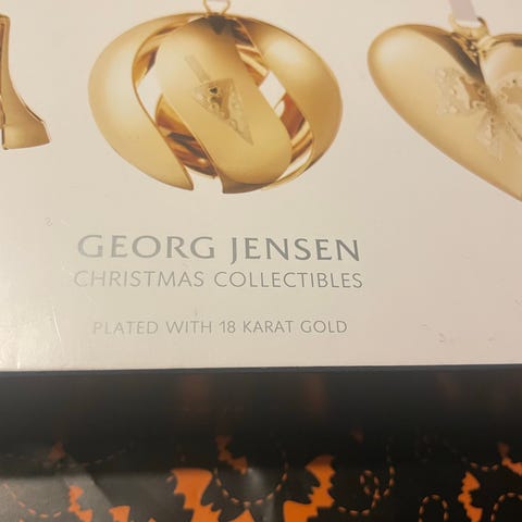 Sæt med 2 stk. Georg Jensen Christmas Collectibles: et agern og et hjerte, begge forgyldt med 18 karat guld. Inkl. original æske og bånd. Ca. 7 cm høje.