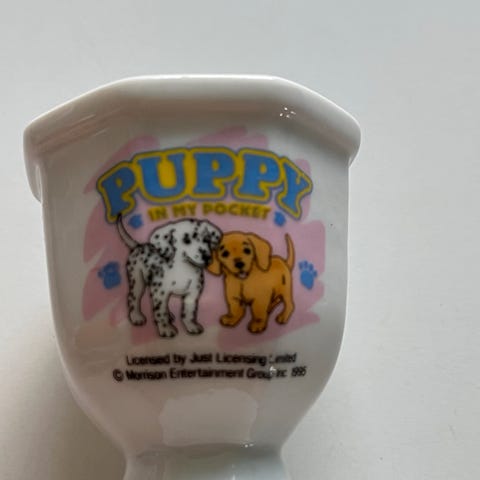 Sødt æggebæger med motiv af to kaniner og teksten "Funny Bunnies". Mærket KIN 92.