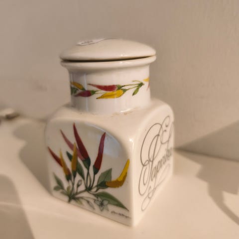 3 krydderi krukker med tegning af Mads Stage. Ingefær,kanel og paprika. 8 cm høje. Vejer 500 gram. 45 kr stykket. 125kr for alle tre.