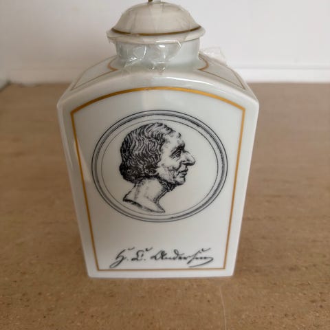 Den er i rigtig god stand, uden skår men lidt slid enkelte steder på guldkanten - se billederne.