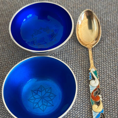 Gammel flaske asiet i blåt glas og sterlingsølv. Mærket "Mema L Q9 - Sweden - Sterling 925 S". Udført i gustaviansk stil. Diameter: 10 cm. Højde: 3,2 cm. Fremstår i pæn og intakt stand.
