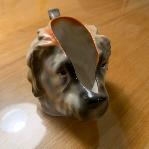 1940’s Vintage Erphila tekande/kaffekande udformet som Terrier hund med pink sløjfe. Keramik/fajance. Mærket med nummeret 6702B. Tyskland. Tidsrelatetet patina i form af et lille afslag i det ene øre og i hældetuden ( se billeder).