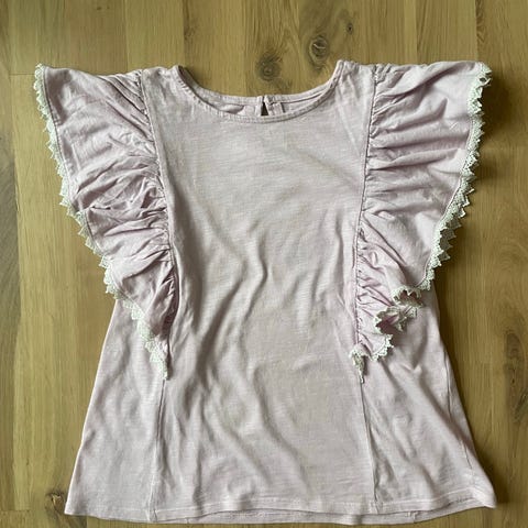 Skøn lavendelfarvet t-shirt i str 8 år. Brugt men pæn.