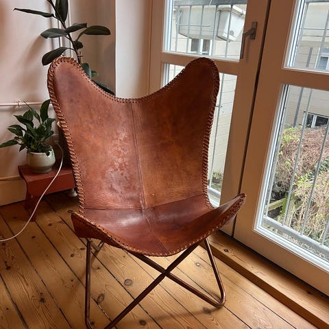 Butterfly stol med sort læderbetræk og metalstel. Stolen har et karakteristisk design med syninger langs kanterne og et krydsformet stel i metal. Velegnet til brug som loungestol eller ekstra siddeplads.