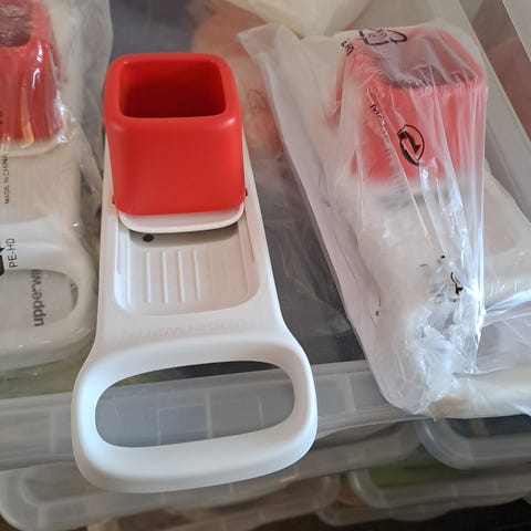 Forskellige køkkenting - Brugt mandolin jern - prop trækker - sæbe skål - og plastik ske fra Tupperware —. Alle dele Med brugs spor. Kan sendes for 47 kr.
