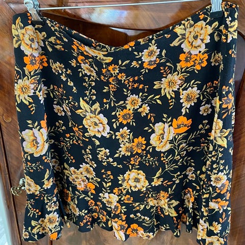 Har elastik i taljen og lynlåslukning i siden. Taljen er normalt høj
