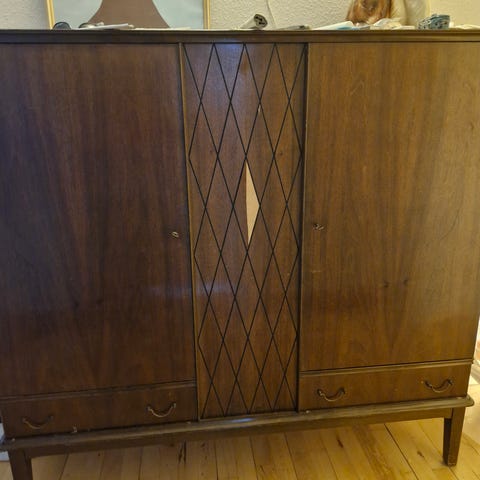 Flot gammel skab massivt træ. Udskæringer i låger. Hylder og skuffer indeni.