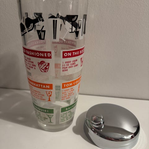 Fin ældre drinks shaker / cocktail shaker med opskrifter på glasset og låg med hældetud og skruelåg.
