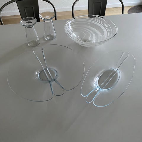 Holmegaard fyrfads stage i glas. — små skåle i keramik. Med afslag på bund. Se billeder —. Brugsspor. Kan sendes for 57 kr.