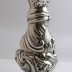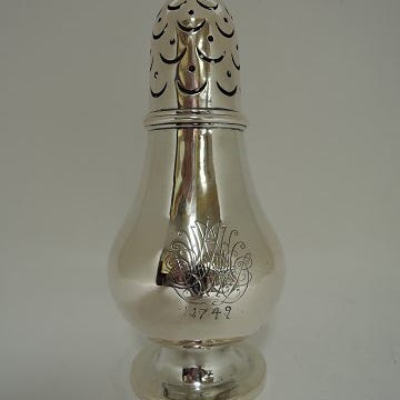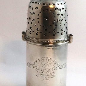 Mikkel Gregersen, Aarhus (1714-1729). Granatsukkerbøsse af sølv med cylinderformet korpus (830). Højde 18 cm.