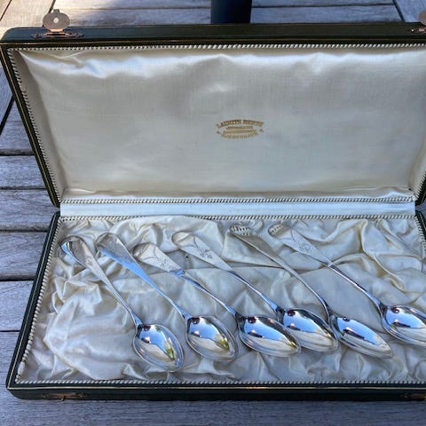 Laurits Berth. 5 sølv serveringsdele forgyldte (830). Længde mellem 14,5 - 25 cm. Produceret 1912. I original æske.