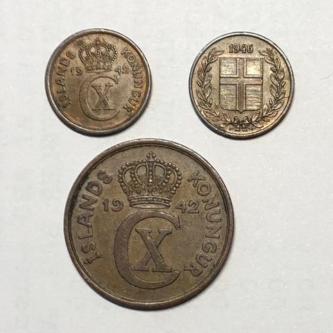 Island. Altinget 1000-års jubilæum 930-1930. Sæt bestående af 2 kronur 1930 bronze, 5 kronur 1930 sølv og 10 kronur 1930 sølv.