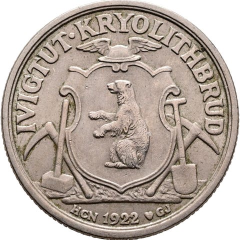 Grønland. Kryolith. Kobbernikkel 10 kr. 1922. Med riflet rand.