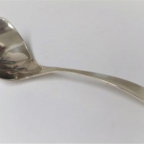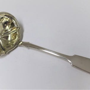 Franske sølv sauceskeer. Sølvbestik (950). Forgyldte. Længde 13,6 cm. Et sæt på 6 styk. De er mærket med krone & HH. Prins Harald & Prinsesse Helena.