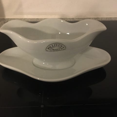 Porcelæn, Sovsekande med underskål, Tallerken, skål, Pillivuyt bistro, Pillivuyt Bistro hvid / sølvfarvet
