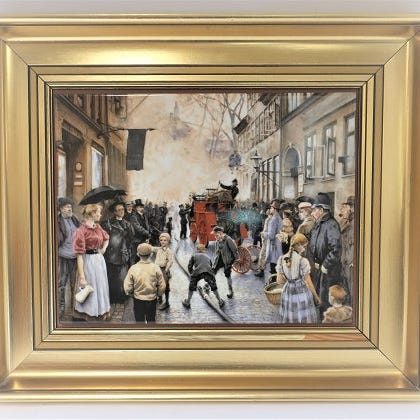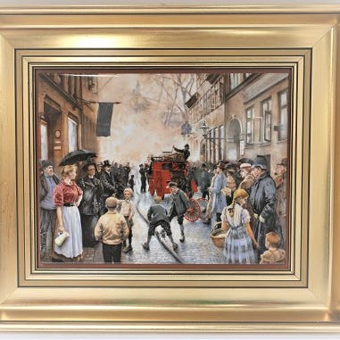 Bing & Grøndahl. Porcelæn maleri. Motiv af Paul Fischer. Ild i Skindergade. Størrelse inclusiv ramme, 40*33 cm. Produceret 1750 styk. Dette har nummer 875.