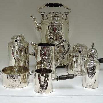 Sølv service, bestående af thekande, kaffekande, vandkande, flødekande og sukkerskål. Sølv (830). Produceret 1948.