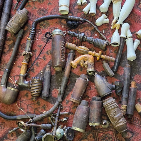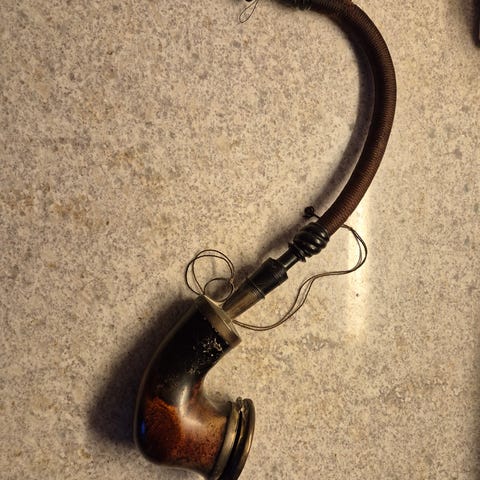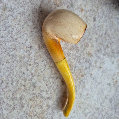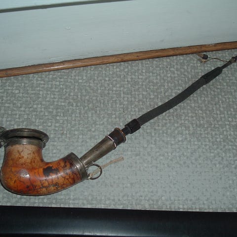 Merskumspibe med sølvmontering. Rigt udskåret ben med jæger holdende bjegged i det ene horn. Indgraveret : Fra det Slesviske Gendameri 1. juni 1851 - 30. november 1864. Længde 60 cm.