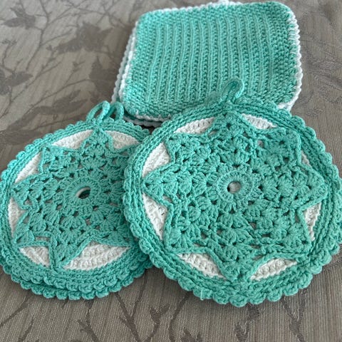 Grydelapper og kartoffel varmer hvid og mint grøn De er brugte. —Kan sendes for 47 kr