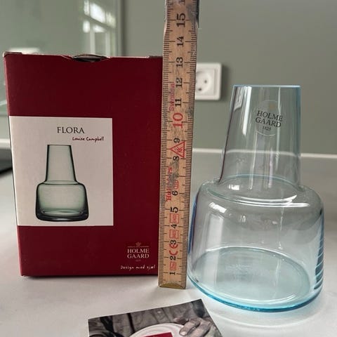 Flora vasen i blåt, mundblæst glas måler 24 cm. Vasen har en kort hals og er designet af den prisvindende designer Louise Campbell. Designet er skabt ud fra tanken om, at friske blomster skal have masser af vand. Vasens rummelige bund gør den solid og rummelig, mens den smalle åbning byder enkelte langstilkede blomster velkommen