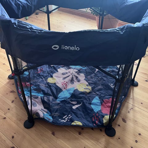 Stable og praktisk legegård i navy blå.Mål: ca. 1m x 1m.Let at folde sammen og tage med.Brugt meget lidt. Lidt plet på mesh og små ridser på tasken – se billeder.