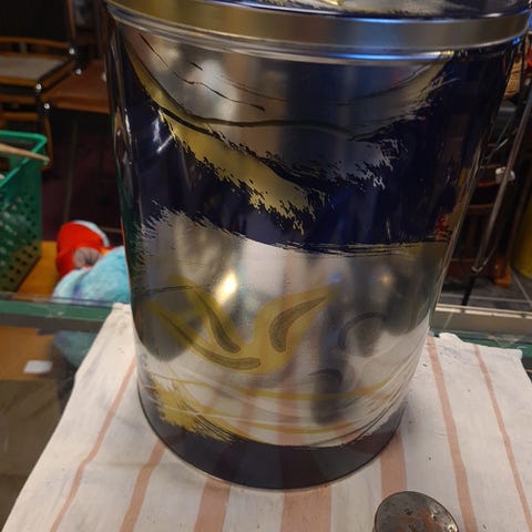 Super velholdt oval slikdåse med låg fra norske Kielland (ca. 1950). Mål: højde: 11,5, bredde: 10,5 cm. Ren og pæn; uden rust og buler og med det originale klistermærke! Pris: 50 kr kontant. Sender først ved køb for 100 kr før Porto med gls. Har mange andre flotte gamle dåser til salg.