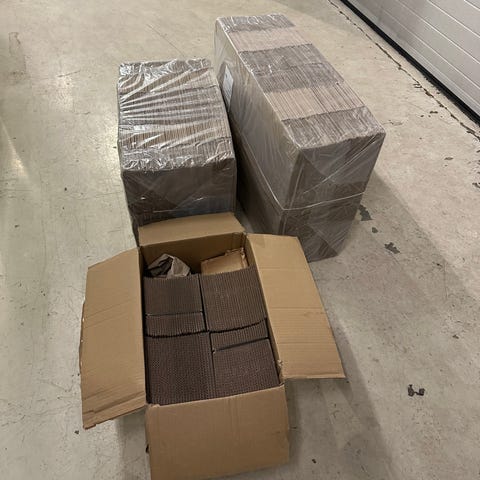 Bundet i kolli af 15 styk. Der er ialt 3 kolli = 45 styk papkasser (Ikke brugt).