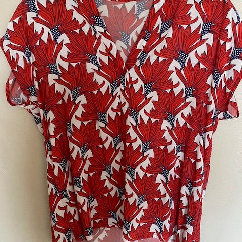 Blusekjole, Peter Hahn, str. M, Blå, rød, hvid, Bomuld, Næsten som ny, Foret blusekjole fra Peter Hahn, multifarvet i farverne blå, hvis, rød, trekvart ærme, rund halsudskæring, går til knæene, med smalt bælte i livet, som ny, A skåret skørt