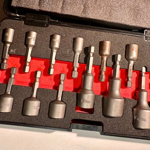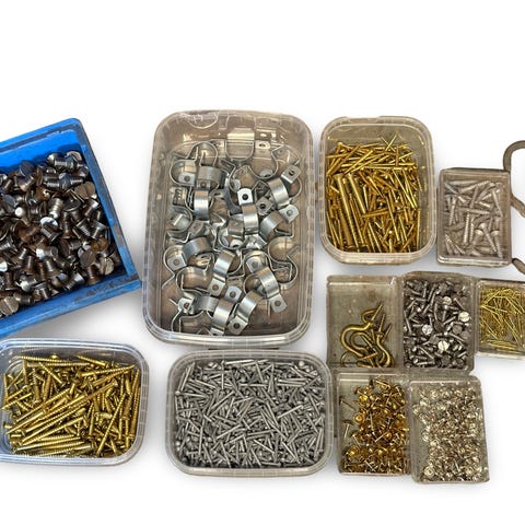 Sortiment med forskjellige skruer og bolter i ulike størrelser og materialer, oppbevart i en blå plastboks med flere rom. Egnet for diverse reparasjons- og monteringsoppgaver., der er 2 boxe