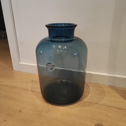 Stor vase, klar blå og hvid indeni. Hel og uden skår.