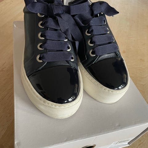 Flotte mørkeblå sko med lyseblå detaljer ved hælene. Virkelig flot stand. Jeg sender gerne, de vejer 794 g uden indpakningen.
