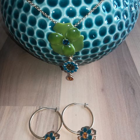 bling bling ring Pilgrim med røde og orange sten str. 56 og tofarvede grøn/hvid keramik vedhæng til små kreoler øreringe.