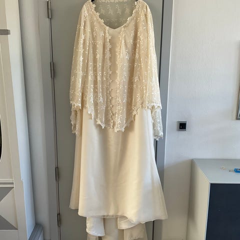 Den smukkeste brudekjole i blonder/kniplinger med tilhørende underskørt, så den puffer ud helt rigtigt. Den er ikke fuldstændig hvid, men mere henad cremefarvet.
