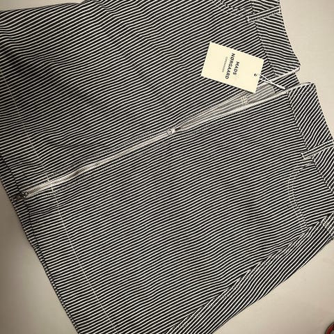 Hickory Punk Riva er en A-formet og lårlang nederdel med gennemgående lynlås og sort/hvide mælkedrengestriber.