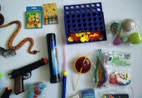 Bue og pil, legetøjspistoler (bl.a. en med lys og lyd, en med lyd), skyder med skumpatroner, sæbeboblepistol, trædolk, kalejdoskop, dinosaurer, bjørn, klapperslange med raslelyd, snurretop med lys, "lyskaster" til batteri, Kalaha (i trææske), 4 på stribe, spillekort, bolde m.m.