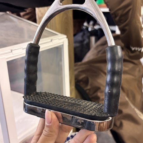 "Compositi" stigbøjler. Sorte og meget lette. Jeg har nydt, at de ikke slår mod hesten. Jeg vurderer dem til str large. (Jeg har kunnet have en str 45 ridestøvle i dem - købte dem, fordi jeg een gang for mange sad fast ved fald fra hest)