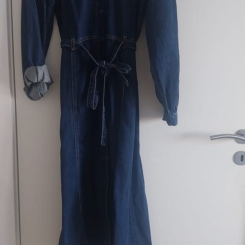 NY og Ubrugt Blå denimkjole med 2 x lommer, trompetærmer og slids i siderne. Lukkeknap bagpå. Lavet i lyocell. Stadig med mærke på. Aldrig taget i brug.