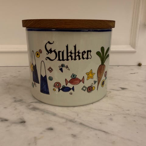 Knabstrub sukker krukke med trælåg pæn og i orden uden afslag eller revner intakt trælåg