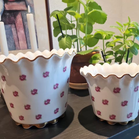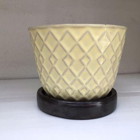 Skjuler, Upsala Ekeby, Skøn gul karlskrona skjuler / urtepotteskjuler. Håndmalet motiv af fugl og grene. I hel og fin stand. Måler 16,5 cm i højden og 22 cm i diameter. Med bølget kant foroven og forneden.