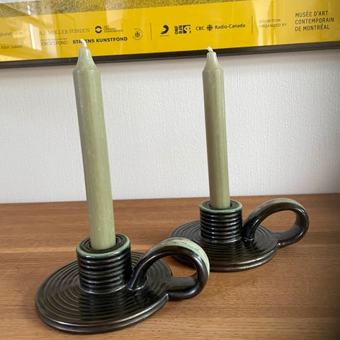 Lysestager og askebæger, Michael Andersen, 2 stager og askebæger Af Michael Andersen fra Bornholm. Den ene stage har et skår på bagsiden men det ses ikke
