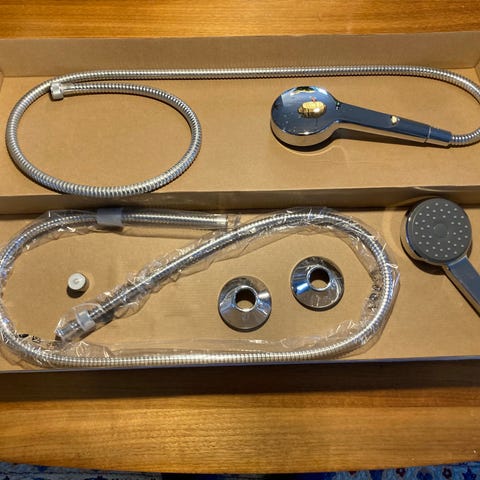 Justerbar brusehoved af plast med åben-/lukkeventil.
