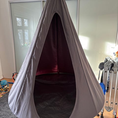 Fritstående hængestolsstativ i vejrbestandigt stål op til 50 kg. Balkon, terrasse, børneværelse - indendørs eller udendørs: Perfekt til abegynge, minihængekøje og hængende sæde. Nypris 660kr.