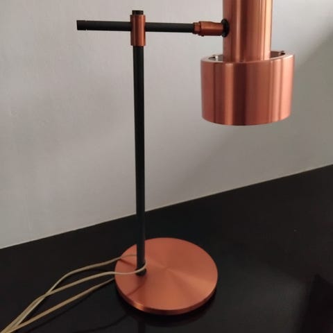 Jo Hammerborg bordlampe i en kombination af sort og kobber. Lampen har et elegant design med en justerbar arm og en solid base. Velegnet til skrivebord eller som læselampe i stuen.