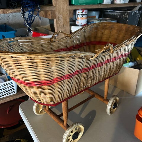gammel dukkeseng på hjul og 1 sovepose