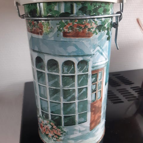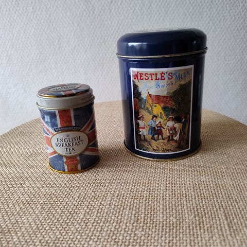 2 ubrugte dåser. De er beige, og der er én til kaffe og én til sukker.