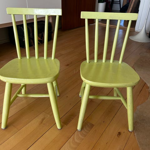 Stol, Retro og Ikea, Fire søde børnestole på stribe. Alle af træ.