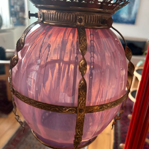 Ampel, Messing og glas., 100 år gl., Antik loftlampe i messing. Ophængt i 3 kæder fra loft. Ombygget fra petroleumslampe til el med stor fatning. Totalhøjde 107 cm, der kan reduceres ved at fjerne led i kæderne. Glasskærm er udskiftet til en ny og er derfor uden ridser og skader. Meget flot antik lampe. Kan ikke sendes.
