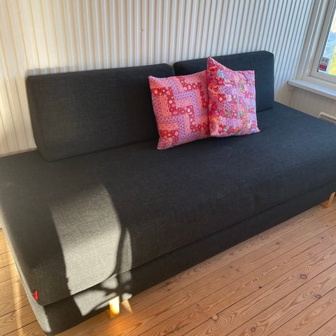 Sofa / sovesofa i fin denim mørkeblå stof. Praktisk fold-ud del. Fremstår med lidt patina på armlæn se billederne, ellers fin stand.