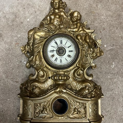 Antik kaminur fra 1850-1870, rigt ciseleret med blomster og bladværk. H36, D11, B38.
