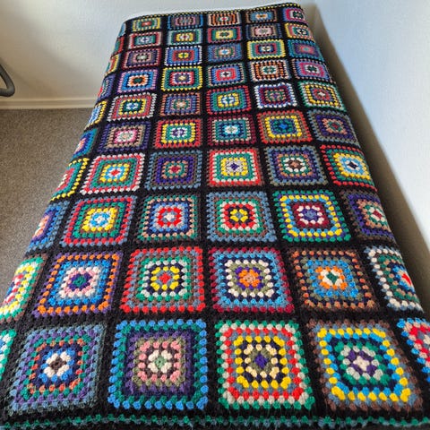 Sengetæppe, b: 110 l: 202, Oldemor firkanter, håndhæklet, fin stand